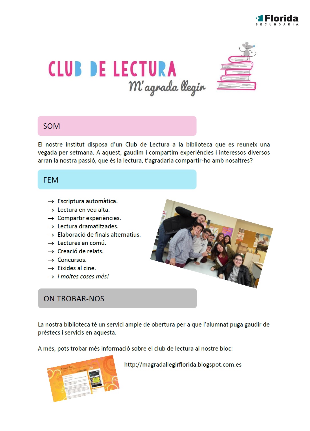 Benvolgudes i benvolguts amics de la lectura, per fi ha aplegat el dia, demà podrem mostrar al món el que fem al nostre meravellós Club de Lectura. Demà, “M’agrada llegir” fa la seua presentació en societat! I, qui millor que vosaltres per fer-ho? Els millors “comercials” del món mundial!